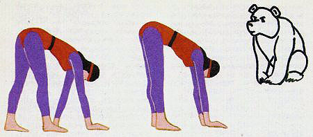 Неуклюжий медведь. Стоя на прямых руках и ногах, начинаем делать шаги левой стороной тела, затем – правой. Ноги не сгибаем, голова опущена, тело расслаблено. Несколько шагов вперед и столько же назад.